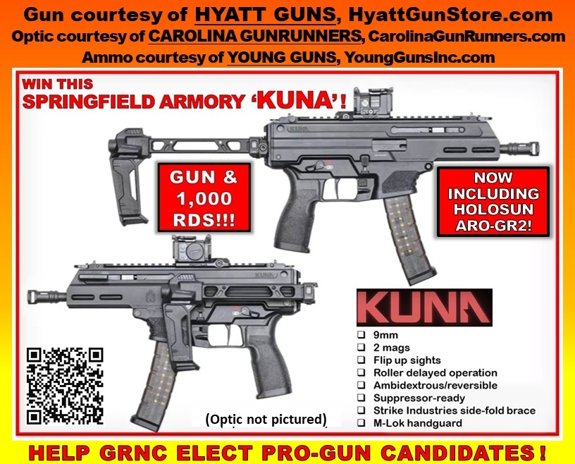 Buying raffle tickets means that in addition to getting a chance at a Springfield Kuna and 1,000 rounds of ammunition, you will help GRNC-PVF keep anti-gunners from occupying offices critical to gun rights.